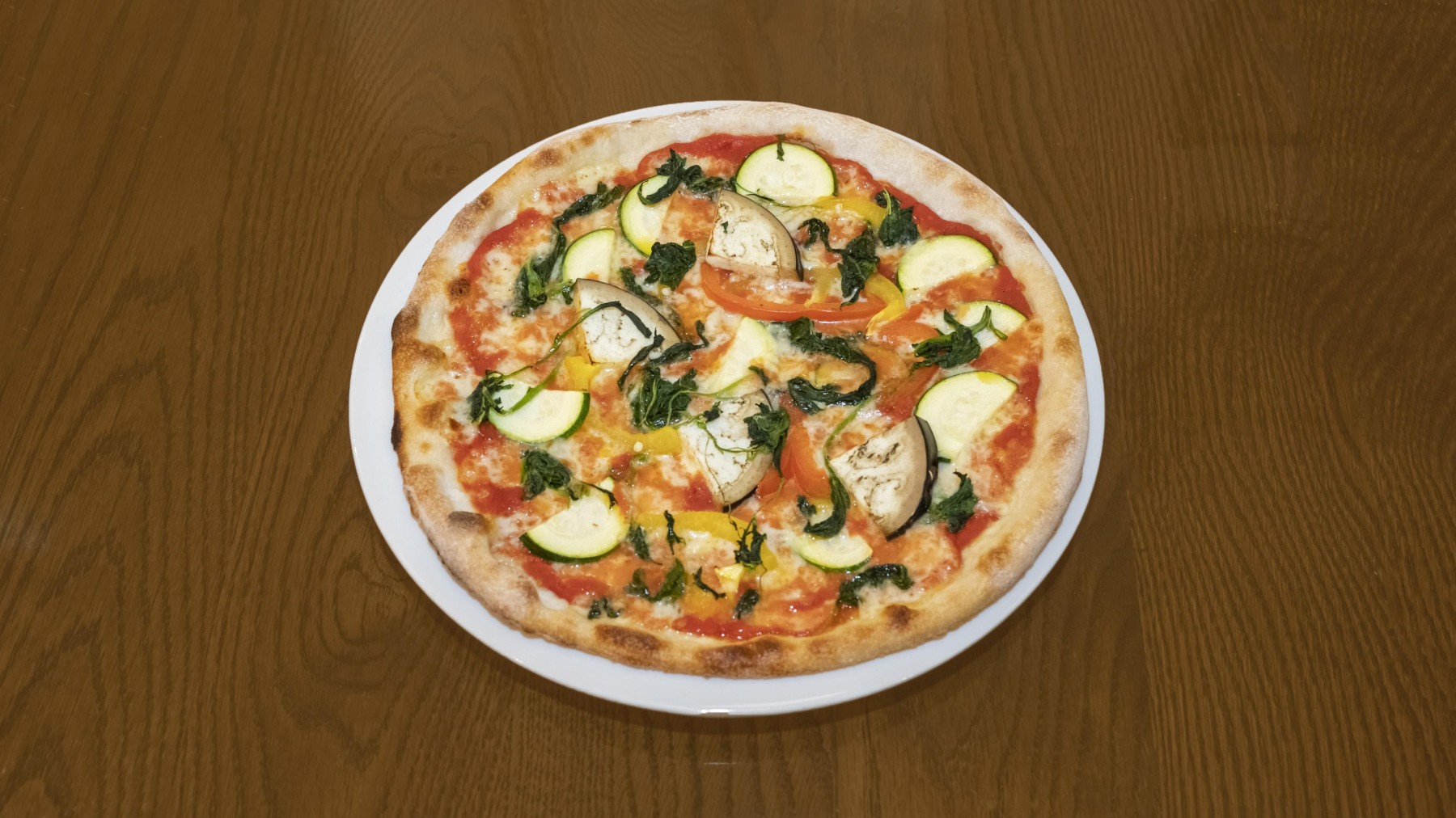 £11.70Tomato base, mozzarella, roasted courgettes, aubergine, bell peppers & red onions